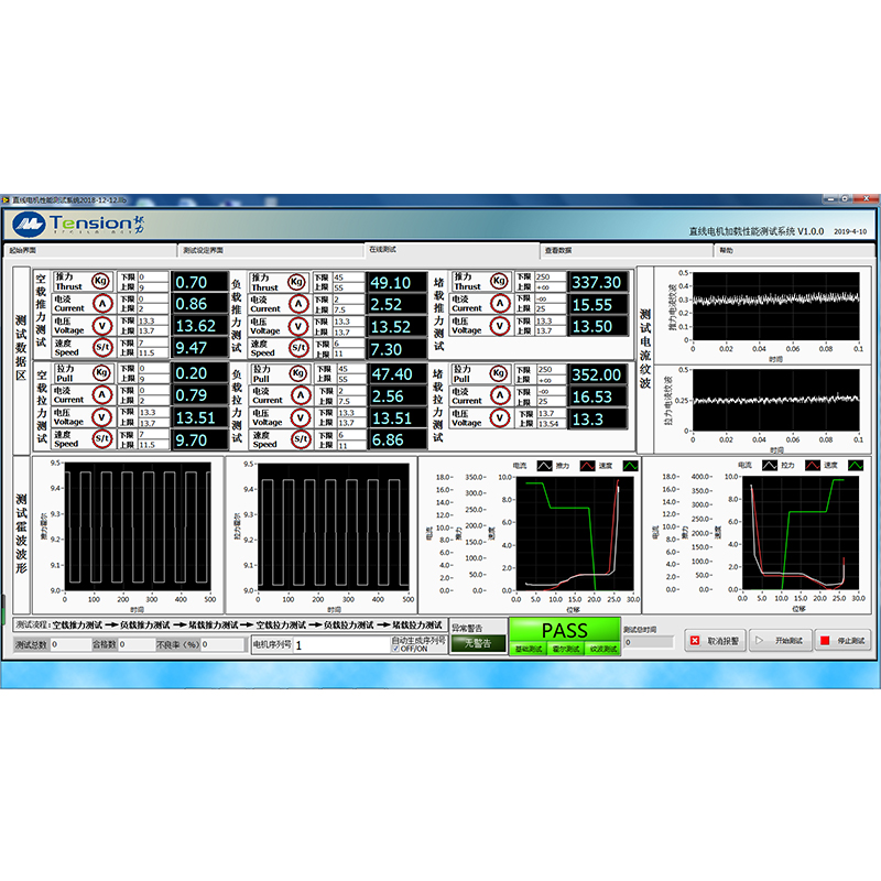 C0-MTSF-2800LH該系統采用伺服電機加載檢測被測電機在空載與負載狀態下的推力與拉力,包括電機速度、電壓、電流、行程等參數,以及電機在堵轉下的電流與推拉力,同時在測試過程中可以檢測電機的電流紋波及霍爾信號,整套測試軟件實在LABVIEW環境下開發的,具有友好的測試界面與圖形分析功能,可以同時計算并顯示多個參數(推拉力、轉速、移動距離、電壓電流等), 系統將工程師與操作員界面分開,便于管理,測試數據可以查詢、儲存并可以下載,可以根據客戶的要求生成特定的報告格式。