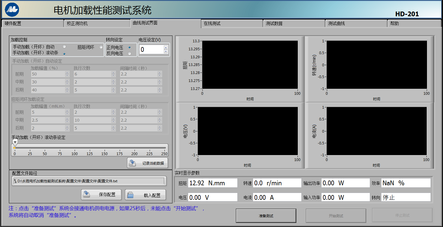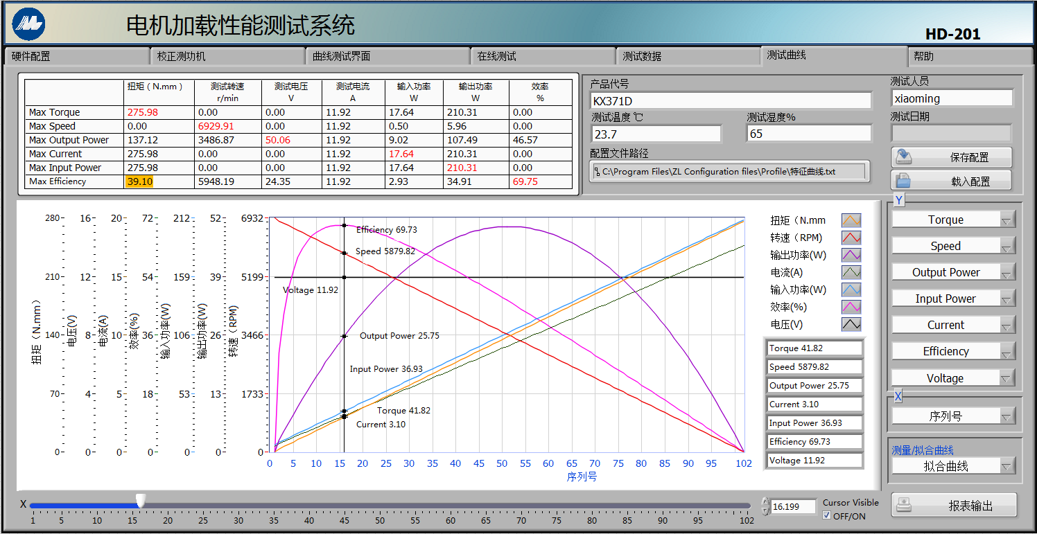4.測(cè)試軟件用LABVIEW編寫(xiě),具有特色的測(cè)試與圖形繪制功能,可以計(jì)算并顯示多個(gè)參數(shù)(扭矩,轉(zhuǎn)速,輸出功率,電壓,電流,輸入功率,效率,轉(zhuǎn)向等)